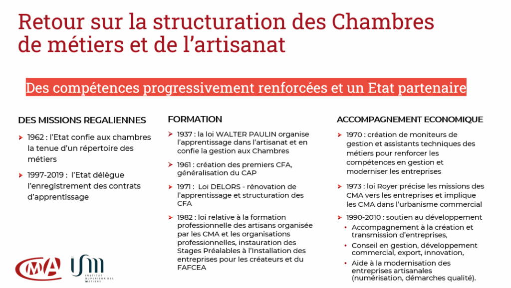 Alors que les Chambres de Métiers et de l’Artisanat fêtent leur centenaire en 2025, cette conférence a permis de revenir sur les grandes dates de la structuration du réseau, sur les succès du réseau et les principaux enjeux à venir concernant l’accompagnement des entreprises artisanales.