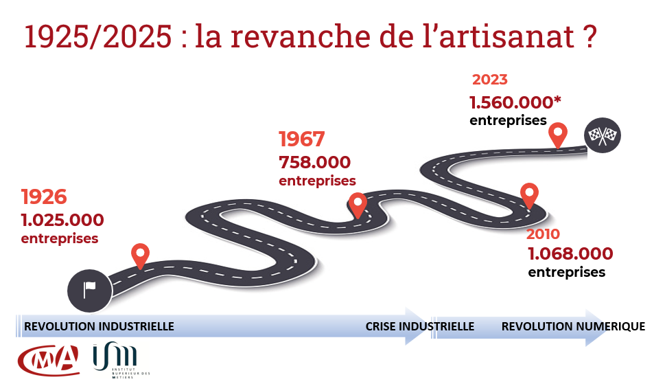 Les années 1970 à 2000 sont des années de stabilisation du tissu artisanal. La poussée de l’entrepreneuriat dans ces activités à compter de 2005 entraîne une hausse progressive du nombre d’entreprises, hausse devenue exponentielle avec la création du régime micro-entrepreneur.