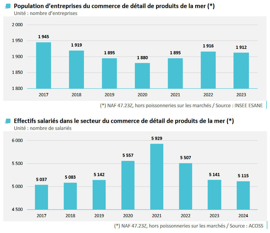 En 2023, l’Insee recense 1 900 poissonneries artisanales sédentaires (codes d’activité 47.23Z – Commerce de détail de poissons, crustacés et mollusques en magasin spécialisé) qui font parties du paysage du commerce de proximité, hors poissonnerie ambulantes sur marché. Ce nombre d’entreprises est relativement stable ces dernières années.