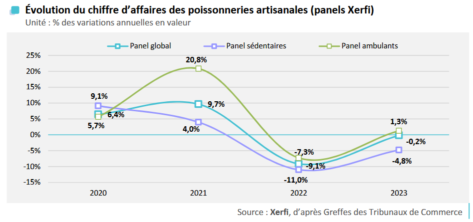 Les poissonneries ambulantes montrent une meilleure résistance aux fluctuations du marché que les sédentaires. Après la reprise post-confinement en 2020 (+6,4 % pour le secteur), elles ont bénéficié d’une forte hausse en 2021 (+20,8 %), tandis que les poissonneries sédentaires progressaient plus modérément (+4 %). La crise énergétique et l’inflation de 2022 ont pesé sur le chiffre d’affaires global (-9,1 %), avec un recul plus important pour les sédentaires (-11 %) que pour les poissonneries ambulantes (-7,3 %).