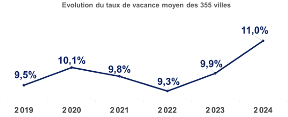 Le taux de vacance est plus élevé dans les villes de 50 000 à 100 000 habitants (13,8 %) que dans les villes de plus de 100 000 habitants (8,7 %). Sur la période 2019-2024, 37 % des 355 villes étudiées ont toutefois réduit leur taux de vacance. Cette part atteint 48 % pour les villes de 50 000 à 100 000 habitants.