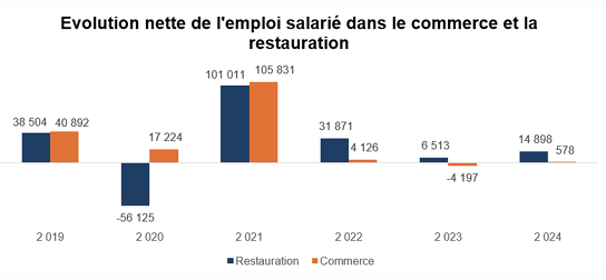 Après la crise sanitaire, la dynamique de l’emploi devient plus irrégulière. La restauration enregistre une baisse en 2020, suivie d’une forte reprise en 2021. À partir de 2023, la création d’emplois ralentit, avec une baisse de 4 197 emplois, puis une quasi-stagnation en 2024 (+578 emplois)
