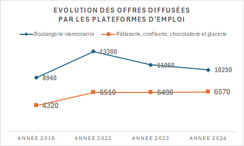 Depuis 2022, on constate certes une baisse pour les emplois en boulangerie-viennoiserie, alors que les offres sont stables dans les postes de pâtisserie-confiserie-chocolaterie- glacerie.