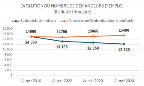 Cette hausse des offres explique probablement la baisse du nombre de demandeurs d’emplois en boulangerie-viennoiserie et les difficultés de recrutement observées par les entreprises. Pas de baisse du nombre de demandeurs d’emploi en revanche pour les postes en pâtisserie-confiserie-chocolaterie-glacerie, un phénomène lié sans doute au nombre très élevé de sortants de formation dans le métier de pâtissier depuis plusieurs années.