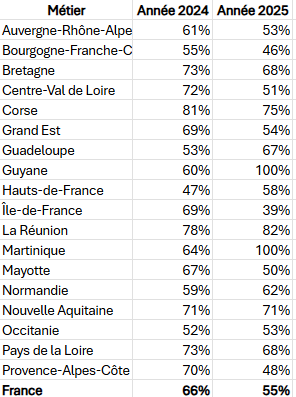 L’enquête « Besoins de Main d’Oeuvre » de France Travail publie un autre indicateur des difficultés de recrutement : 66 % des postes étaient jugés difficiles à pourvoir en 2024, contre 55 % en 2025, des chiffres qui restent plus élevés que pour la moyenne des recrutements (50 %).