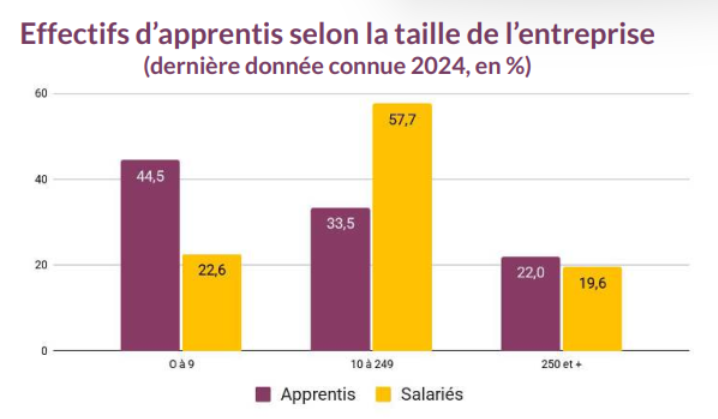 Toutefois, l’apprentissage s’est déployé au sein des entreprises de 10 à 249 salariés ces dernières années, en raison notamment de l’ouverture des aides pour les entreprises à un diplôme de l’enseignement supérieur.